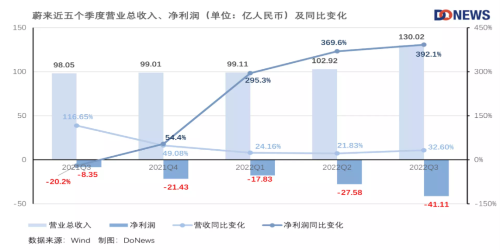 蔚来三季度营收130亿元,超过原来市场预期的129.03亿,同比增长32.6%,环比增长26.4%,再次创下单季新高,这已经是连续十个季度增长。