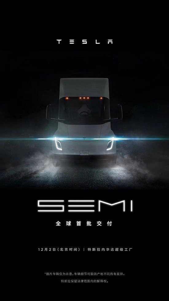 特斯拉Semi半挂卡车全球首批交付时间官宣 北京时间12月2日