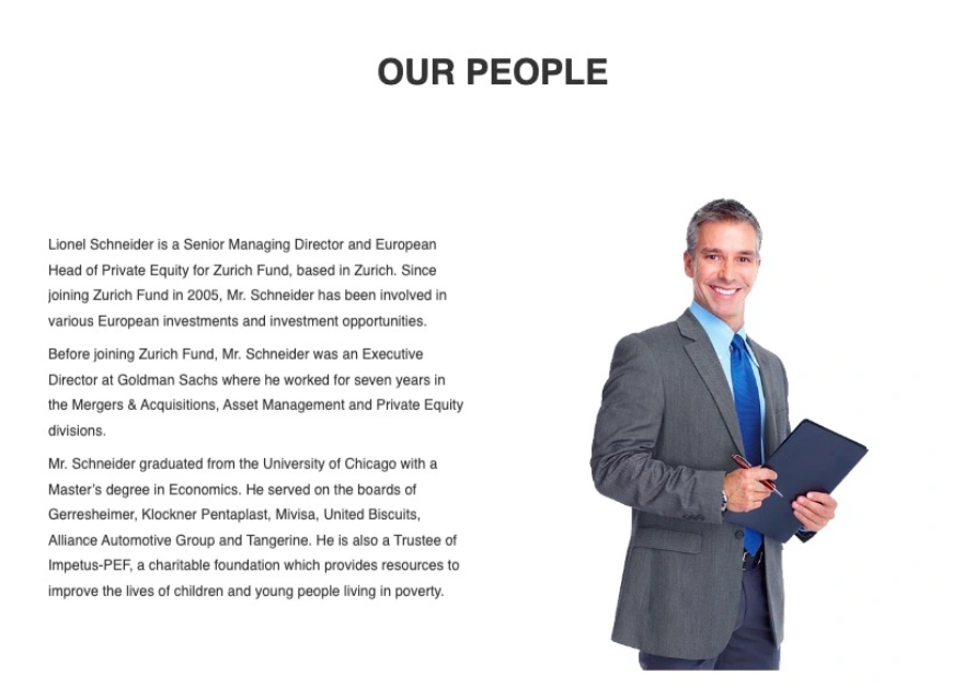 报道还称,济南苏黎士安纳思股权投资基金也是一个完全捏造的公司。该网站的设计与 Annex 的设计相同,而且也充满了模糊和相同的信息,还有一张页面介绍了两位高管,但他们的简介都是用版权图片编造的。