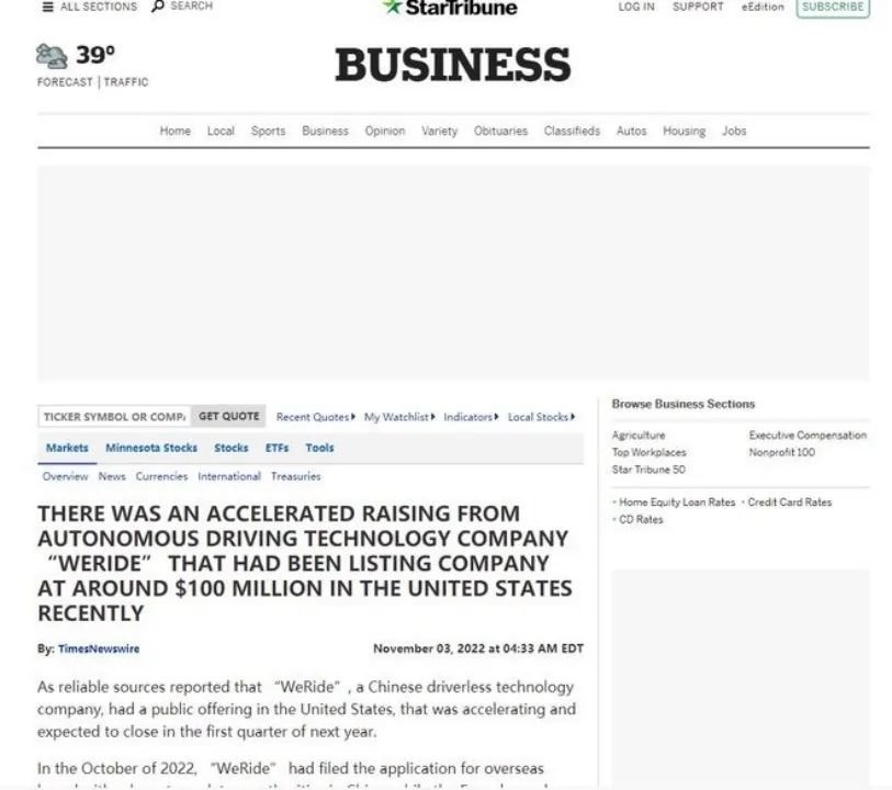 据明尼苏达州最大报纸 startribune 11月报道,总部位于中国广州的智能驾驶科技企业文远知行正加速赴美上市进程,最快可能在今年年底前递交上市申请,明年6月前完成上市。