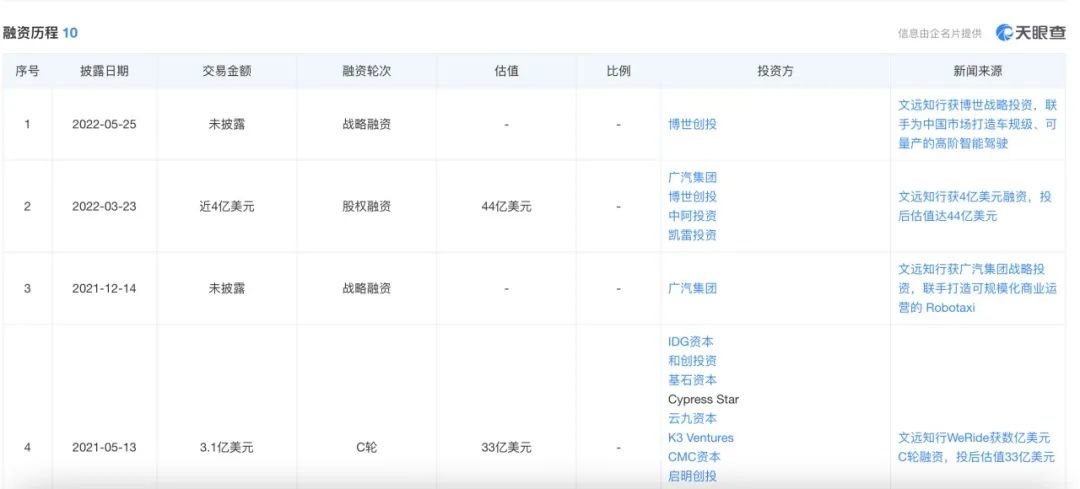 自2020年开始,文远知行的融资速度加快,2年5轮,融到10亿美元,B轮由宇通集团、CMC资本等投资,C轮融资由广汽集团领投。