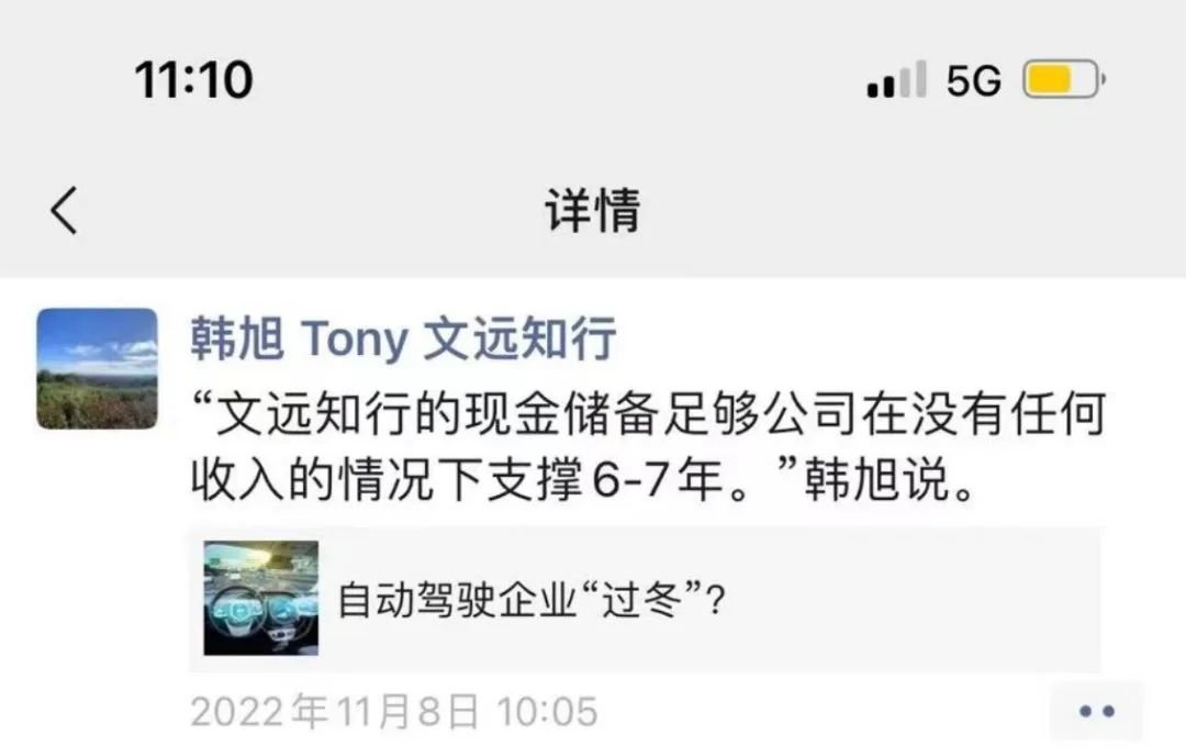 参与路演的投资人透露,文远知行已于今年10月初向中国相关监管部门递交书面申请,CEO韩旭正在美国寻找资本支持。今年8月,文远知行被彭博社报道称其欲融资5亿美元,仅3个月,文远的募资额缩水为原来的4/5,仅为1亿美元。