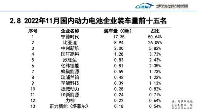 12月9日消息,近日,中国汽车动力电池产业创新联盟发布了11月的动力电池数据。从数据上看,11月我国动力电池装车量为34.3GWh,同比增长64.5%。其中宁德时代、比亚迪、中创新航排在国内动力电池企业装车量前三,占比分别达到了50.64%、26.09%以及5.82%。