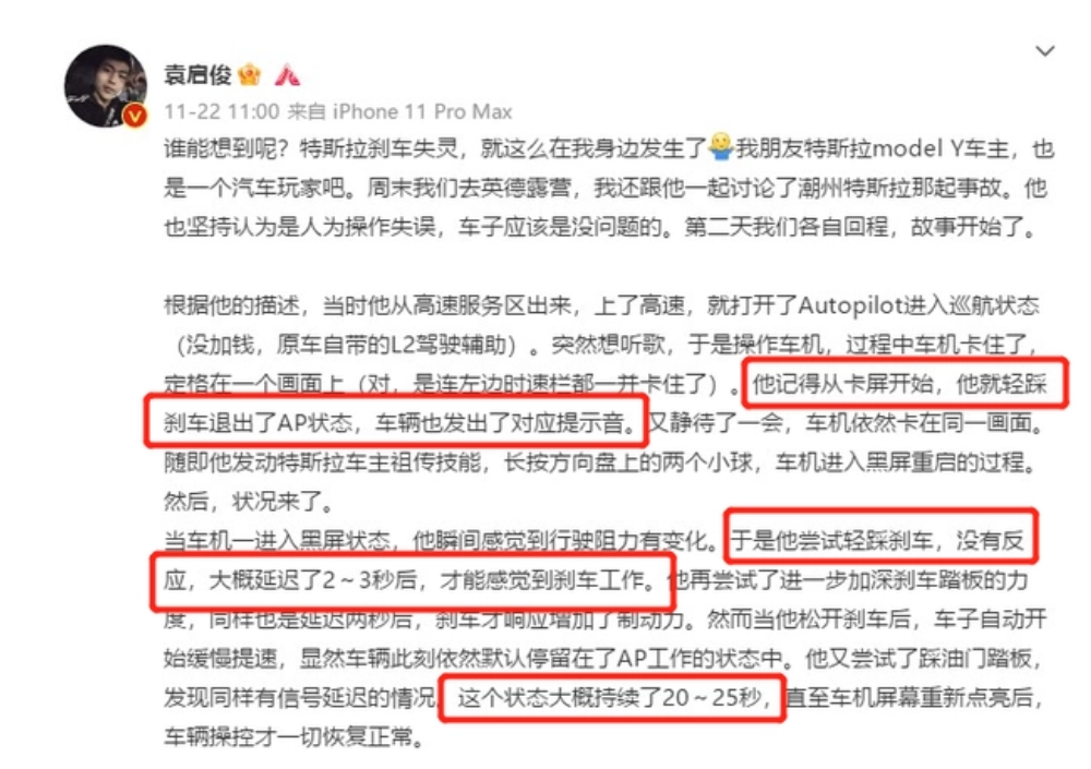 11月底,有汽车博主发文称遇到“刹车失灵”情况,该博主称其好友在驾驶Model Y过程中突然遇到车机黑屏,随即车辆行驶阻力发生变化,刹车系统都出现信号延迟的现象,踩下踏板2-3秒后才感觉到刹车工作,该状态持续了20-25秒,直到车机重启后才恢复正常。