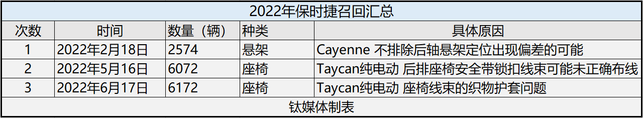 保时捷今年由于被曝出在中国售出的车型,相比海外销售车型有所减配,引起广泛关注,但从公开的召回公告中并没有显示此类召回原因,主要是围绕座椅线束等问题,共召回了1.48万辆,在2020年1月7日至2021年7月16日期间生产的Cayenne和Taycan纯电车型。