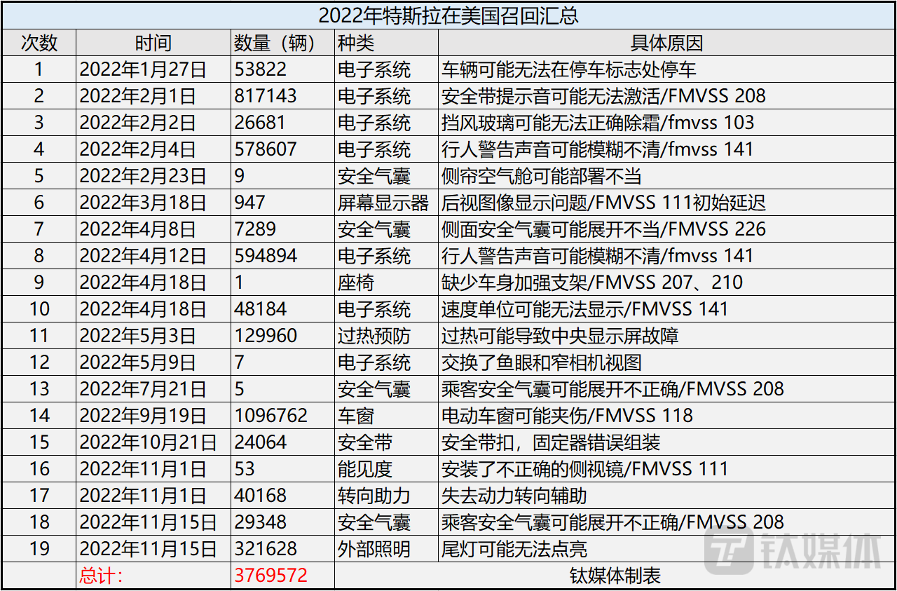2022年,特斯拉在美国共召回了3769572辆车,当然这里存在单辆车同时修复多处问题的重复召回。这其中最为普遍的问题是车窗防夹手功能,召回超过了109万辆,由于车窗在关闭时遇到阻力不会自动停止,这违反了美国机动车辆安全标准(FMVSS)。