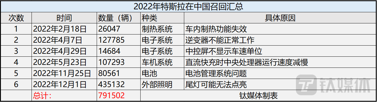 和美国地区召回19次对比,到目前为止,特斯拉2022年在中国召回6次,涉及79万辆车,但召回原因却有很大不同。