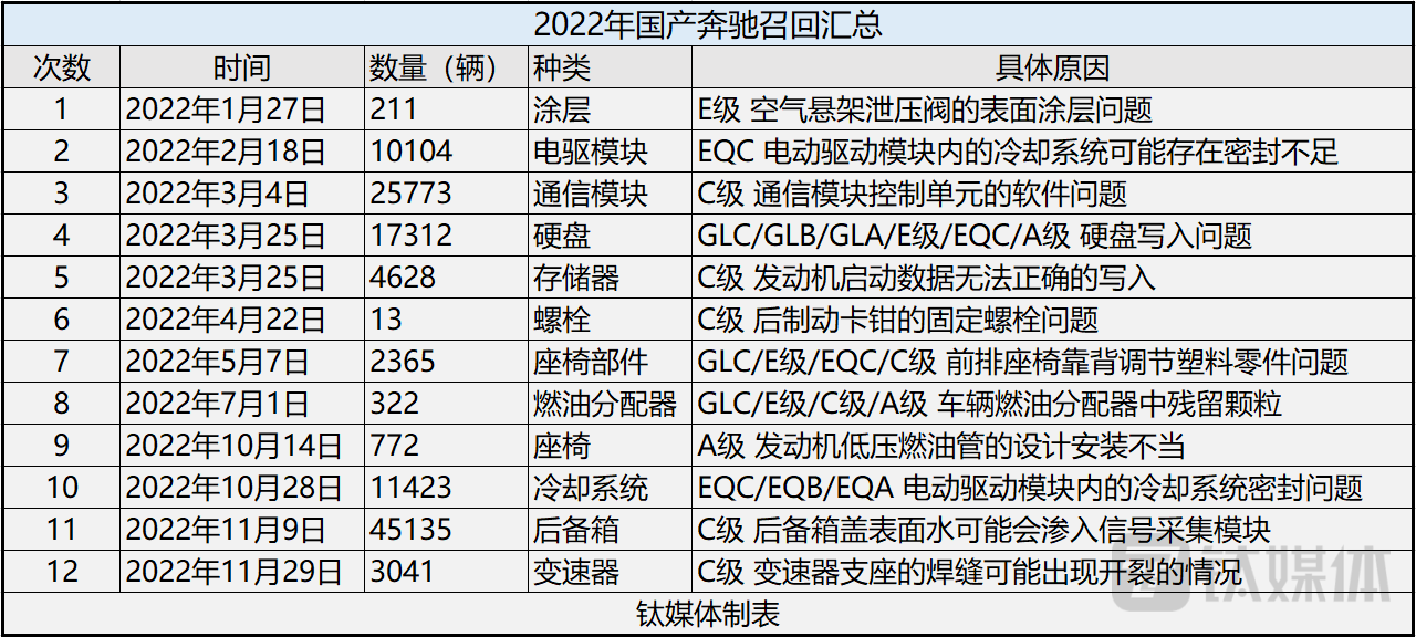 再来看北京奔驰方面,其中销量最高的C级车在召回公告中出现次数最多,其次是纯电车型EQC。表格中汇总了2022年北京奔驰主要召回信息,在控制单元模块上出现问题比较多,其次是密封组件的部分质量问题。