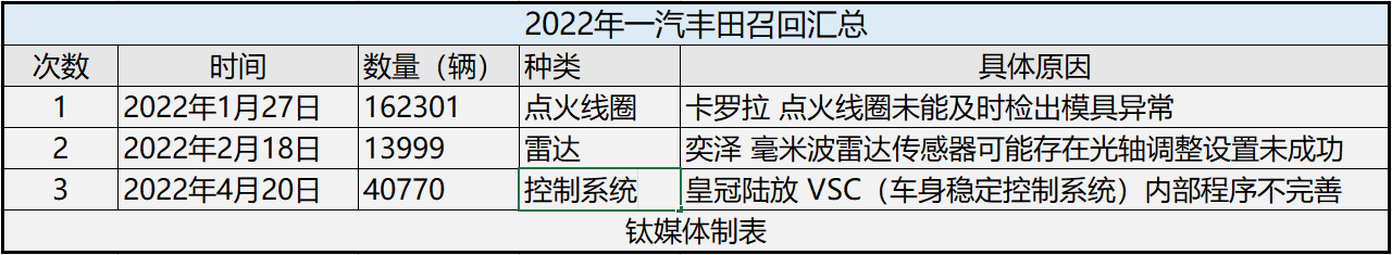 一汽丰田在2022年也有21万辆车宣布召回,主要车型为卡罗拉、奕泽、皇冠陆放。主要问题在点火线圈、毫米波雷达、车身稳定控制系统。涉及车型为2020年5月至2021年8月之间。