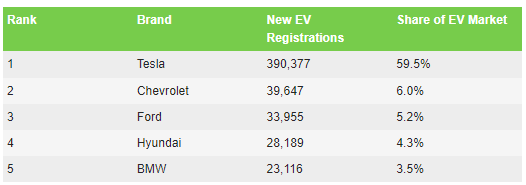 在今年前七个月,特斯拉在美国的新车注册量达到了 390,377 辆,比去年同期增长了 50%,占据了美国 EV 市场的 59.5%。雪佛兰位居第二,其电动汽车在一月至七月期间的新注册量接近 40,000 辆,市场份额为 6%。福特排名第三,其电动汽车在前七个月的新注册量为 33,955 辆,市场份额为 5.2%。整个纯电动汽车市场在上述时期的新注册量达到了 655,986 辆,增长了 67%,占总汽车市场份额的 7.2%。