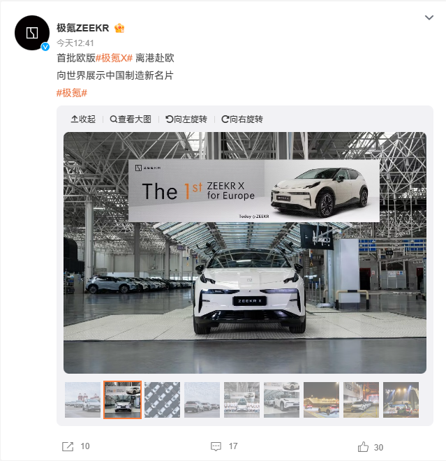 IT之家 9 月 17 日消息,@极氪 ZEEKR 今日中午通过官微宣布,首批欧版极氪 X 车型登上货轮,从上海南港出发奔赴欧洲。