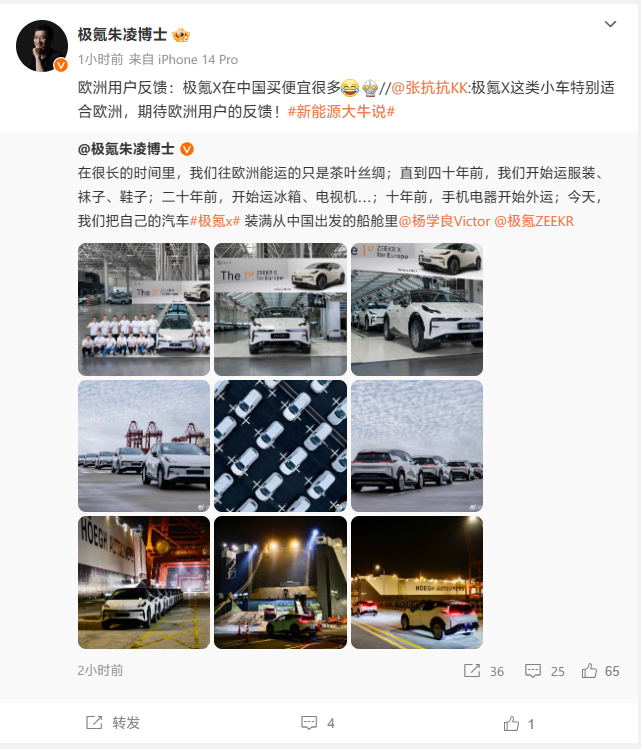 极氪智能科技副总裁朱凌博士对此感慨良多:很长的时间里,我们往欧洲能运的只是茶叶、丝绸、四十年前开始是服装鞋袜、二十年前是冰箱、电视机,十年前是手机,今天将汽车装满从中国出发的船舱里。同时他也打趣道,“欧洲用户反馈:极氪 X 在中国买便宜很多”。