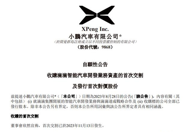 IT之家 11 月 13 日消息,小鹏汽车今日晚间在港交所公告,收购滴滴智能汽车开发业务资产的首次交割已于 2023 年 11 月 13 日发生,首次交割后,标的集团各成员公司均已成为公司的全资附属公司,而标的集团的财务业绩将被并入本集团的合并财务报表中。