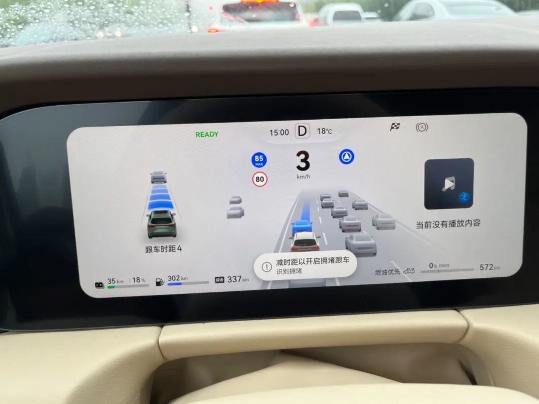 在遭遇拥堵的时候,仪表上会主动提示可以把跟车距离调到最低,从而激活拥堵跟车模式。这时它不会留出很大的距离。