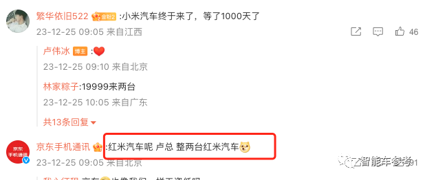 不过当小米汽车官宣后,更多网友还是跑到了“正主”那里催更,小米汽车越来越近了,红米汽车也该安排了吧: