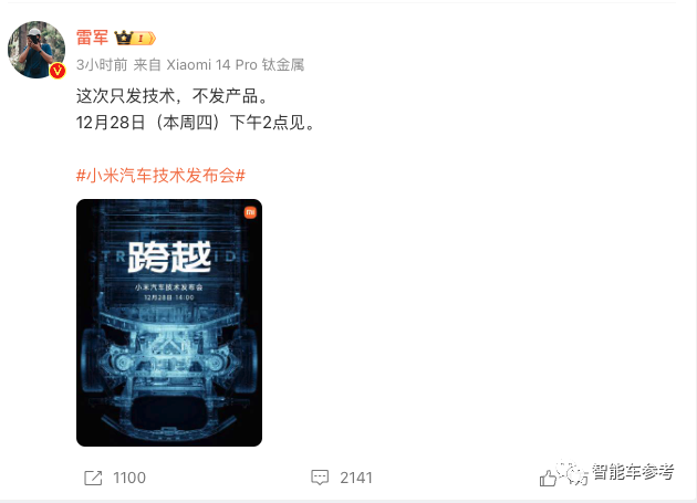 刚刚,小米汽车在各大平台官宣,将于12月28日下午2点举办技术发布会。雷军当即表示: