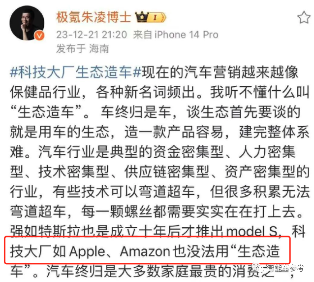 不久前,小米汽车进行了“科技大厂,生态造车”的预热。这Slogan一出,一时引发热议和争论,就有极氪高管坐不住了,开团小米。