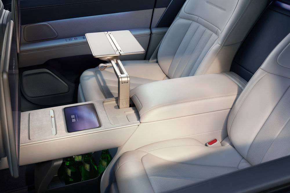 而在豪华配置方面,蔚来将ET9的内饰定义为了“移动行政空间+高效移动办公室+商务会客厅”,主打一个“多功能厅”的概念。其中,车辆只提供4座布局,前后排贯穿了“天空岛”和“行政桥”的设计,将所有座位分割为了相对独立空间。而最尊贵的二排乘客拥有折叠行政桌案、冰箱和两块挂在前排座椅背面的屏幕。