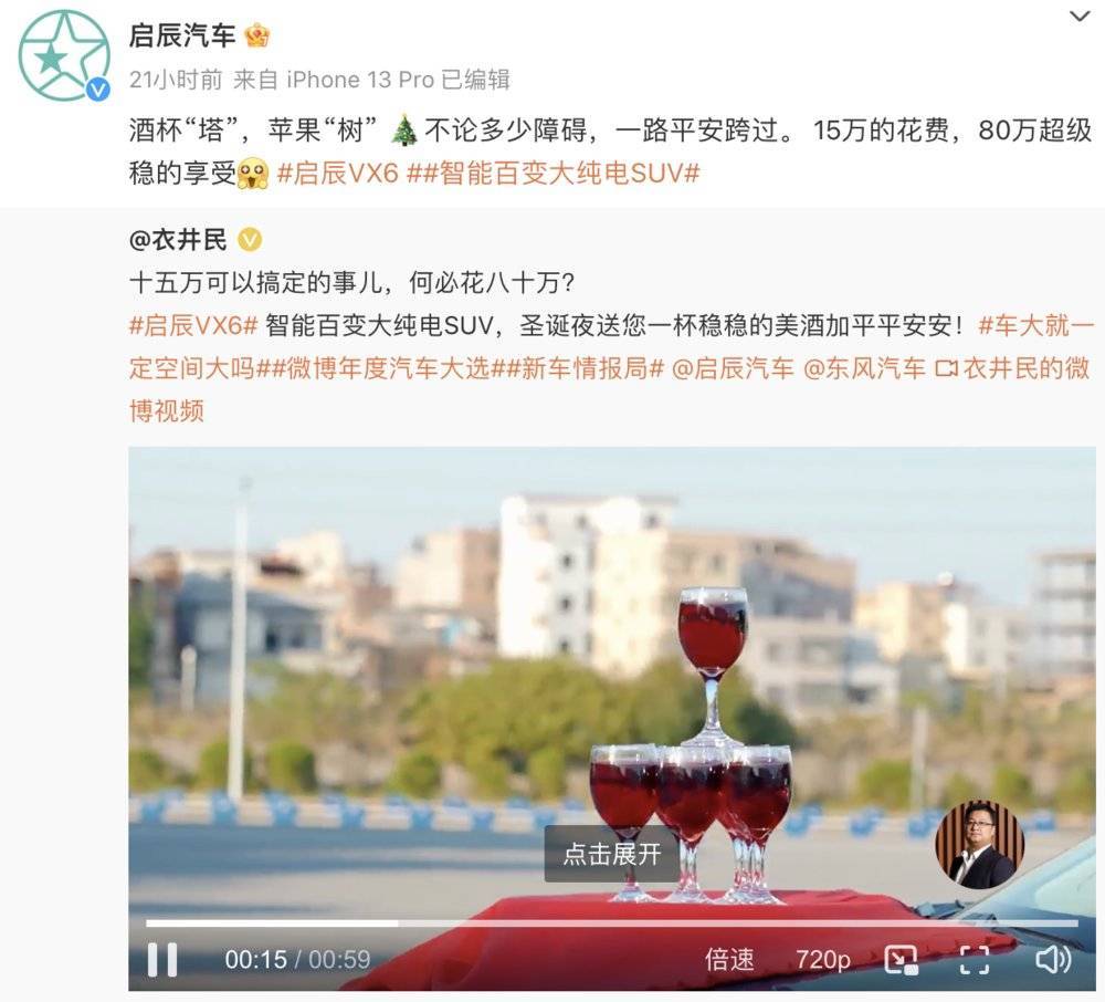 而对于车前机盖上放香槟塔的视频,许久没有消息的东风启辰,干脆用自家的VX6把蔚来的广告片来了个低成本cos。尽管该视频播放加速得有些过于明显,但不妨碍启辰来用“15万的花费,80万的享受”来戳一下蔚来和李斌的肺管子。
