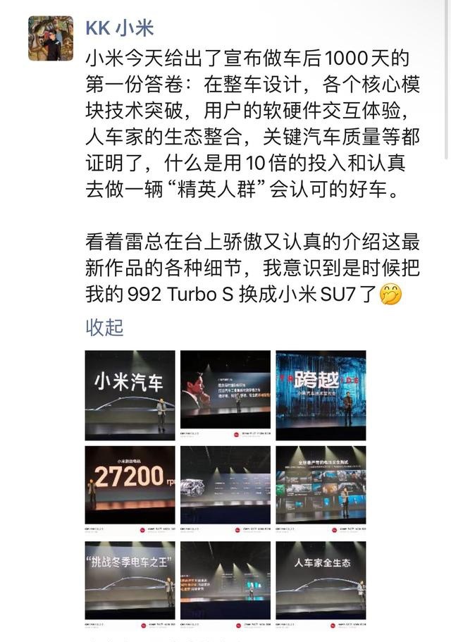 小米前联合创始人黄江吉(KK)在其社交平台上表示:“看着雷总在台上骄傲又认真的介绍这最新作品的各种细节,我意识到是时候把我的992 Turbo S 換成小米SU7了。”
