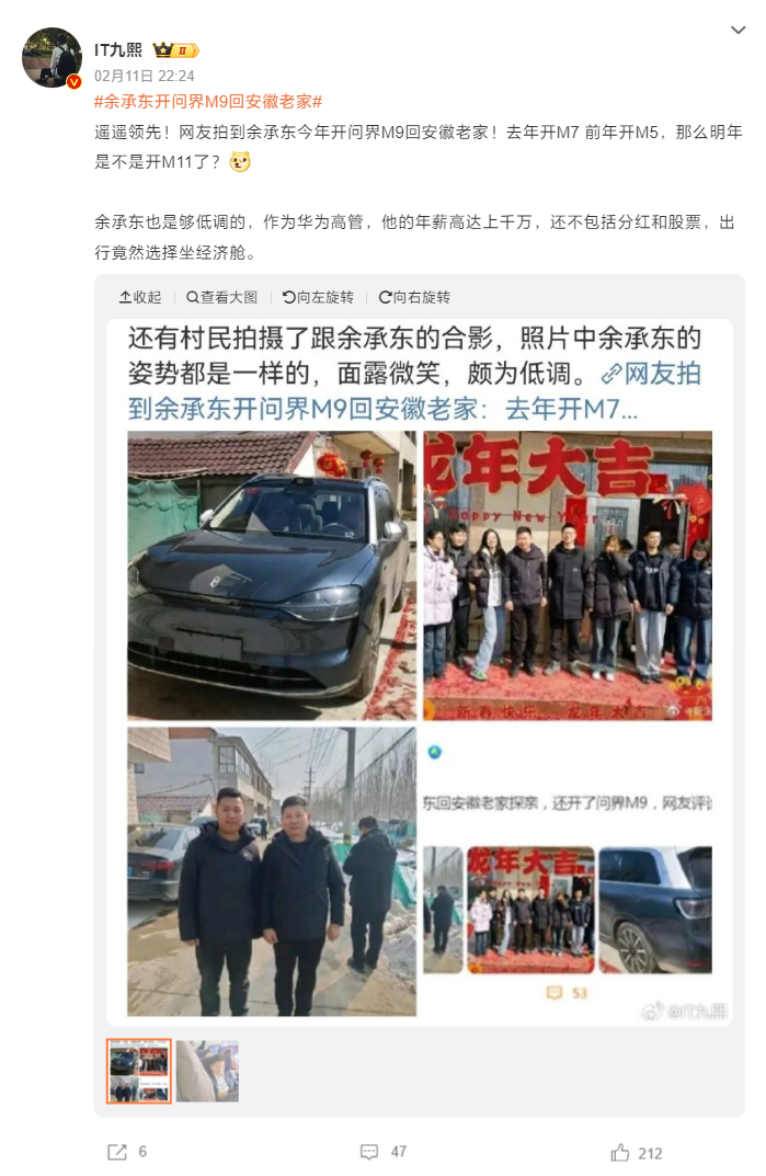 IT之家 2 月 12 日消息,今年春节期间,华为常务董事、终端 BG CEO、智能汽车解决方案 BU 董事长余承东驾驶了一辆问界 M9 回到安徽六安霍邱老家过年。今天大年初三,余承东在朋友圈晒出了自己从安徽老家驾车返回深圳的一段“奇葩”经历。
