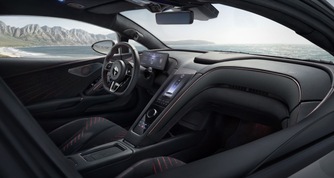 打开这个奔驰 SLR 小鹏 P7 同款的蝴蝶门,映入眼帘的是双座舱的设计,有氛围灯,有键盘值很高的丹拿铂金证据音响,还有相当之多的物理按键。