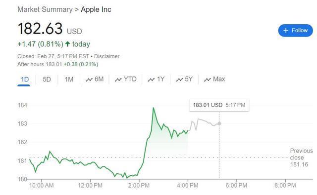 苹果对上述消息拒绝置评。传出消息后,本周二美股午盘时段,盘中曾跌近0.9%的苹果股价持续反弹,午盘转涨后曾涨超1.5%,收涨约0.8%,走出连跌两日刷新的2023年11月6日以来收盘低位。