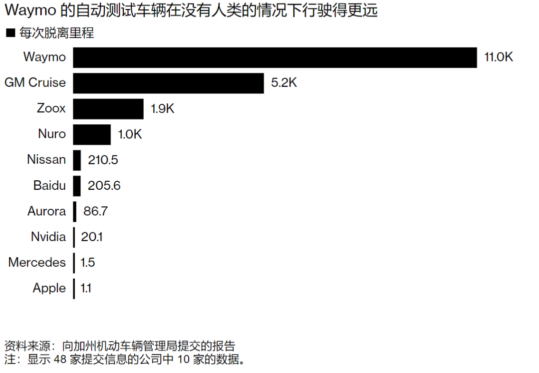 有个衡量自动驾驶好不好用的指标,是一台车在不需要人们干预的情况下能开多远。那时候,主流的几个自动驾驶公司,像 Waymo 和 Cruise ,分别是 1.1 万英里和 5200 英里需要干预一次
