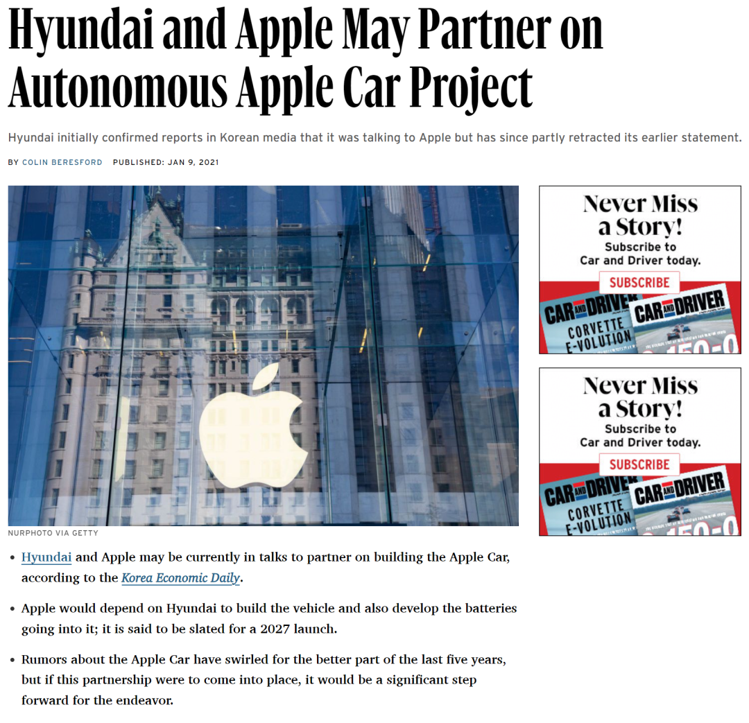 比如在 2021 年的时候就有报道,说苹果和起亚现代勾兑好了造车的事情,搞出来的车子可能会由苹果主导设计、起亚现代负责生产制造。