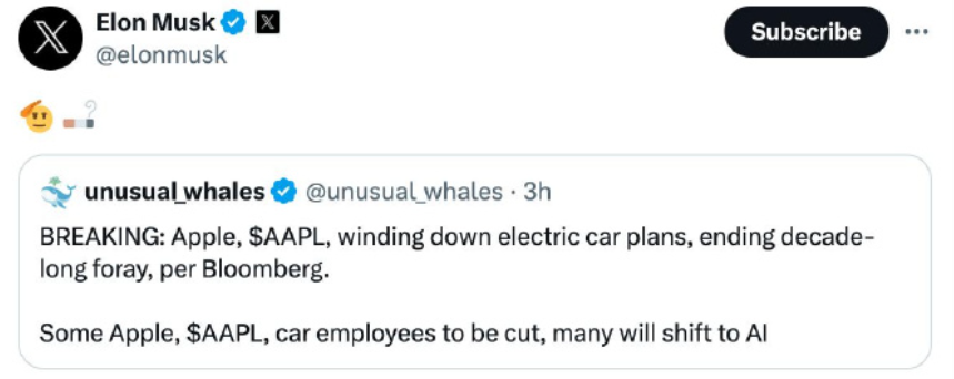 现在苹果不造车了,马斯克的回应也是相当的抽象。。。