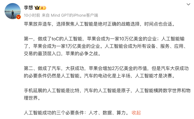 因此这一波的苹果,似乎更像是一波顶级运营,与其搁在造车这拉扯,不如去 AI 那打波大龙团。