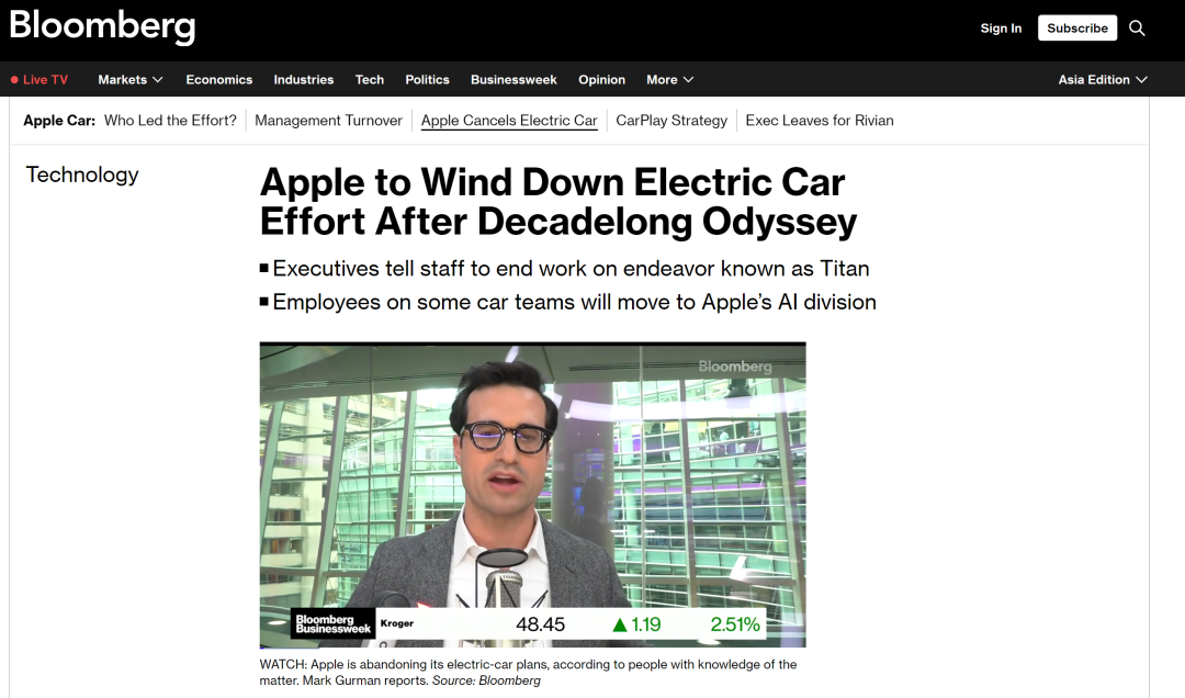 根据彭博社的报道,苹果内部那个代号 ” 泰坦 “ 的汽车项目,在前前后后搞了十年以后,今天还是被苹果内部解散了。