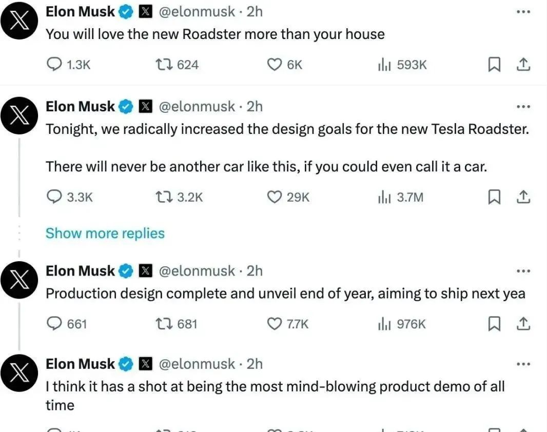不过,老马还是很懂吊胃口的,无论是 19 年还是最近的推特回复,都在暗示 Roadster2 的推力能把车弄起飞,真能实现的话,那就不仅颠覆了汽车悬架,更是让车身稳定系统迈入了新的时代。