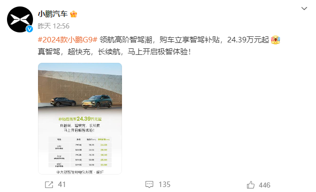 小鹏的价格屠刀则砍向 G9,全系降价 2 万, 入手门槛落在 25 万以内,还给出最高 8000 元的选装权益。