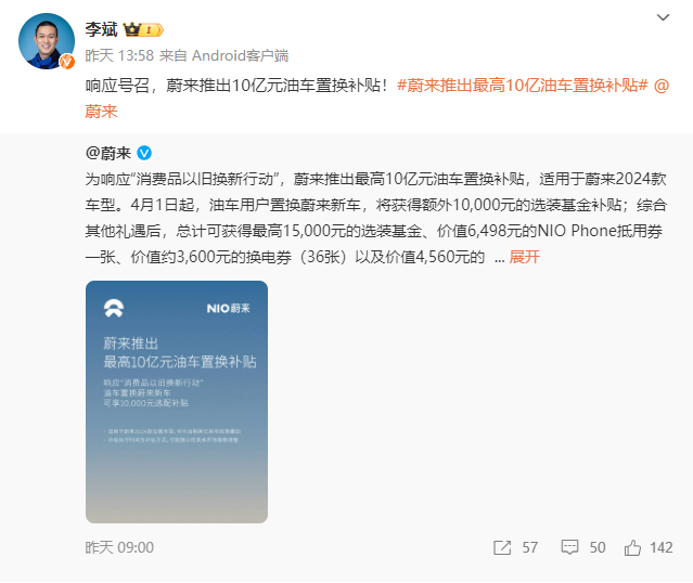 强调不降价的蔚来又推出了新政策——10 亿元油车置换补贴, 适用于 2024 款车型,单车总计最高可获得 1.5 万选装基金、6498 元 NIO Phone 抵用券、3600 元换电券和 4560 元的 NOP+ 一年使用权。