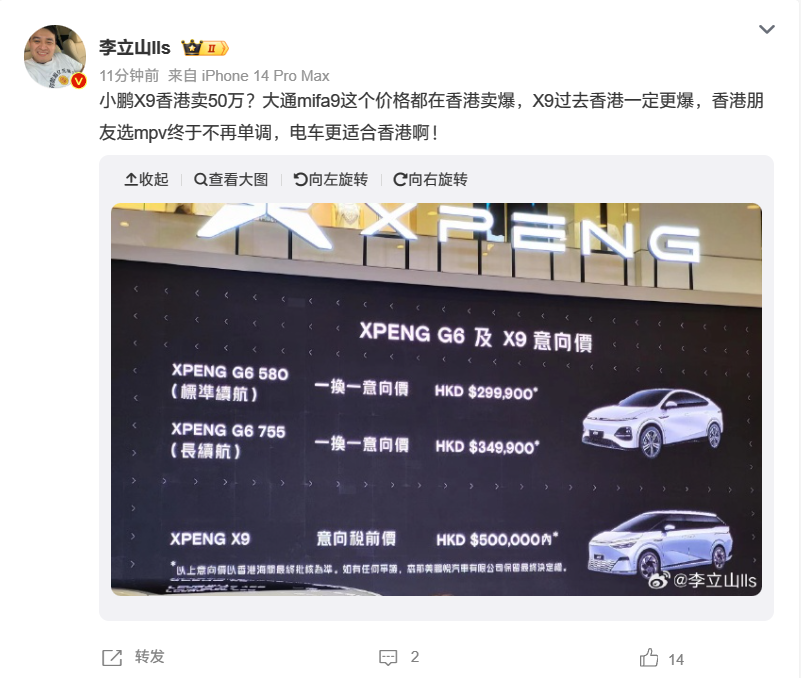 IT之家 5 月 17 日消息,小鹏汽车今日宣布,轿跑 SUV 车型 G6 和 MPV 车型 X9 均于今年下半年登陆香港市场,G6 的“一换一”意向价 29.99 万港元(IT之家备注:当前约 27.7 万元人民币)起,X9 意向税前价为 50 万港元(当前约 46.3 万元人民币)内。