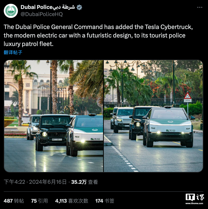 IT之家 6 月 17 日消息,据迪拜警方 X 平台账号,迪拜警察总司令部近日采购了一台特斯拉 Cybertruck 皮卡,参考官方发布的照片,该皮卡采用了迪拜警方标志性的白绿配色涂装,引擎盖还包括迪拜警察的标志,据称将投入于旅游警察巡逻车队中日常使用。
