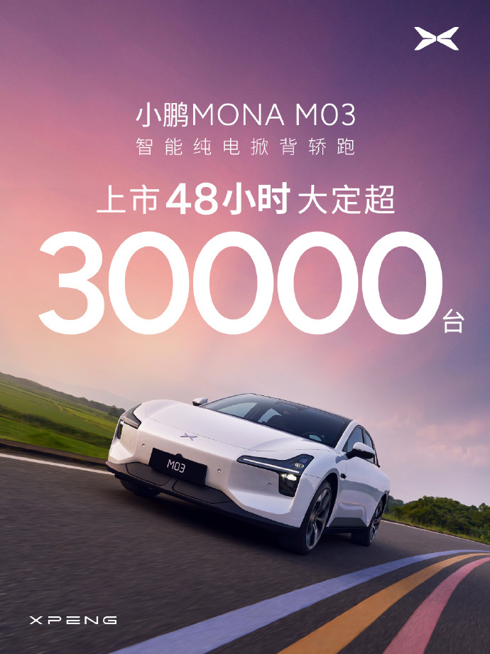 IT之家 8 月 30 日消息,今天上午开幕的 2024 成都车展期间,小鹏汽车宣布,小鹏 MONA M03 上市 48 小时大定突破 30000 台。同样是今天,小鹏汽车创始人、董事长兼 CEO 何小鹏将为首批车主代表交付。