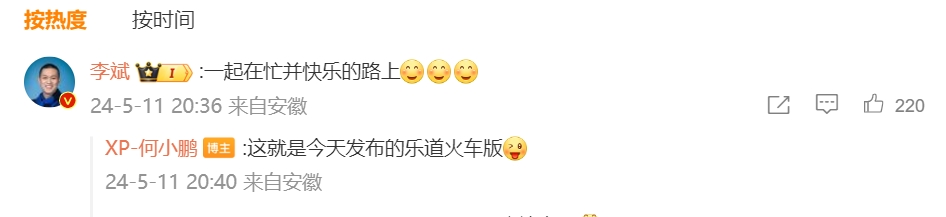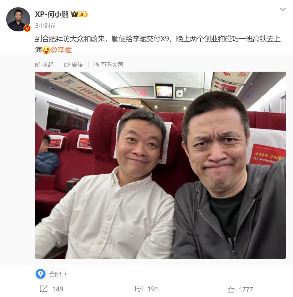 11日晚,何小鹏也在微博发文称,到合肥拜访大众和蔚来,顺便给李斌交付X9,晚上两个创业狗碰巧一班高铁去上海。