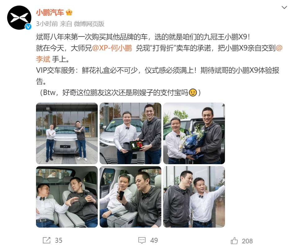 “斌哥八年来第一次购买其他品牌的车,选的就是咱们的九冠王小鹏X9!”小鹏汽车官微写道。