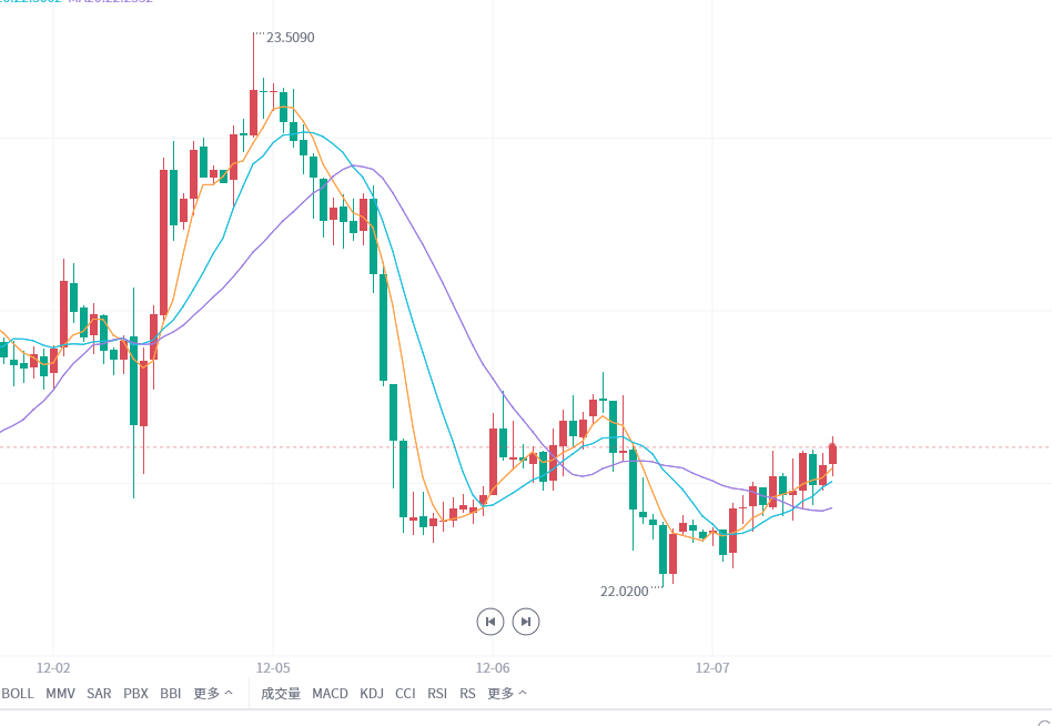 日线震荡;MACD顶背离后初步死叉,KDJ相对高位死叉,K线在200日均线附近录得带上影线的大阴线,暗示金价初步见顶,后面偏向震荡下行,初步支撑在10日均线1768.07附近,21日均线支撑在1760.66附近,若失守该支撑,则增加短线看空信号;11月30日低点支撑在1744.79附近,强支撑在9月12日高点1735.02附近,1616-1809涨势的38.2%回撤位支撑也在该位置附近。在失守21日均线1760.66前,多头仍有重拾涨势的机会,上方初步阻力在1780整数关口附近,周二高点也在该位置附近,11月15日高点阻力在1786.36附近,200日均线阻力在1793.60附近,若能强势收复该位置,则增加后市看涨信号。
