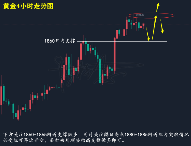 黄金技术面来分析,日线上,周一黄金延续上周五涨势再次展开上行,盘中并在触及高位后小幅回落,录得带上影线的小阳,日线上,今日行情开盘持于隔日收盘价位运行,日内重点关注均线位置;4小时上,周一黄金持于高位运行,并在触及新高后走缓慢下行,当前价位持于1870附近运行,当前布林带处于开口期,MA均线即将形死叉,KDJ随机指标三线并拢向下,MACD指标绿色动能柱开始出现,快慢线死叉向下,综合来看,目前黄金短期有下行,日内操作建议跌至1860-1865附近支撑做多,上方也可关注隔日1880-1885附近阻力,若上行不足也可再次触及做空,日内若出现大幅下跌,则有望跌至1840-1850附近,若出现上涨,盘中则扩大涨幅,可顺势抬高支撑再次做多即可。