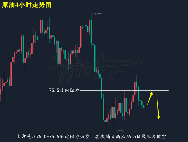 原油技术面来分析,日线上,周一原油上演小幅回落,早盘自低位一度上涨至MA10日均线位置,随后触及受阻回落,录得带上影线的中阳,日线上,今日行情开盘延续跌势,预计或将继续受阻均线位置下行;4小时上,周一原油走震荡上行走势上涨,并在触及日内高位后走震荡下行下跌,直至今日延续,当前布林带处于收口期,MA均线5日线拐头向下,KDJ随机指标三线并拢向下,到达超卖,MACD指标红色动能柱不断缩量,快慢线平行向前,综合来看,日内原油目前涨势受阻,日内建议反弹做空,上方关注75.0-75.5附近阻力,其次日线隔日高点阻力附近。