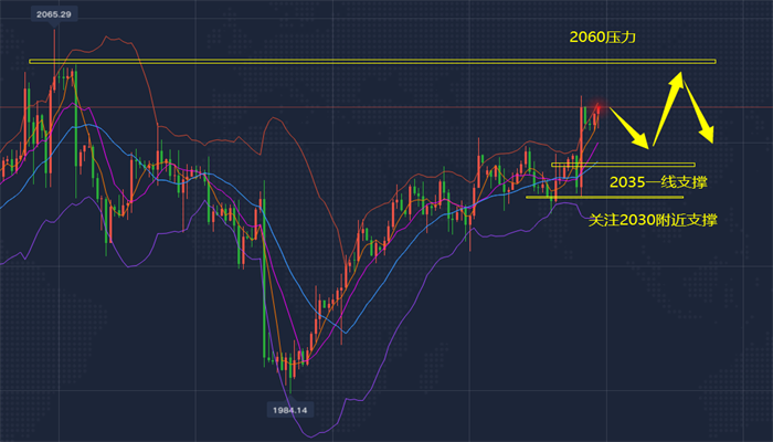 黄金操作思路:亚欧盘激进可以在2050下方参与短空。美盘可以在下方2038-2035区域多单参与,止损2030下方,目标2050上破看延续2055空单参与,如果2050不破继续承压可以空,目标2030。