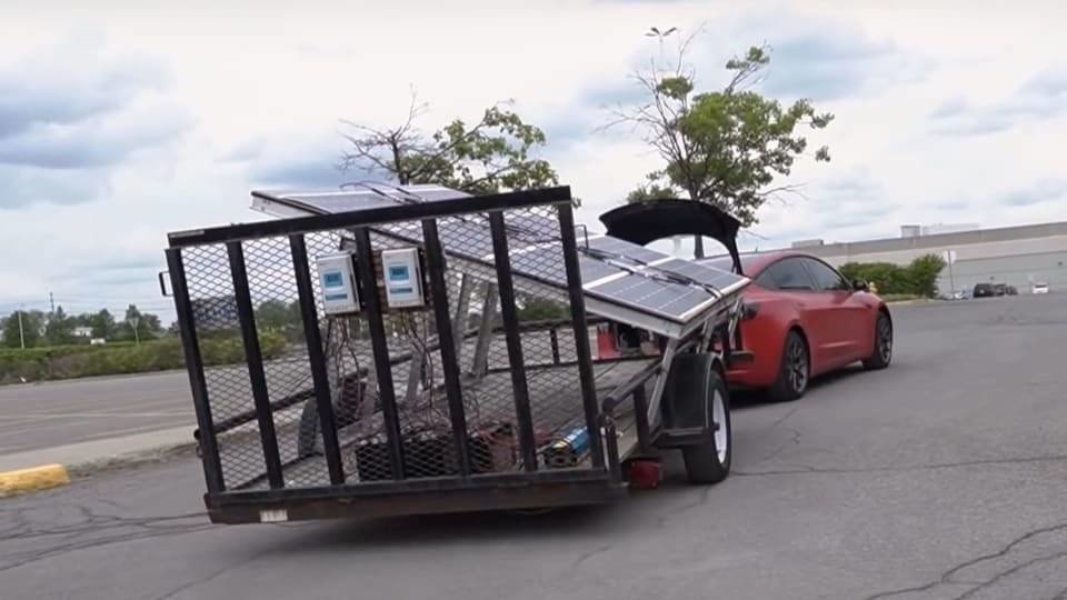 比如油管博主ItsYeBoi,就在特斯拉车后拉了八块太阳能电池板。而根据他的计算,至少需要10天才能把特斯拉Model 3给充满电。